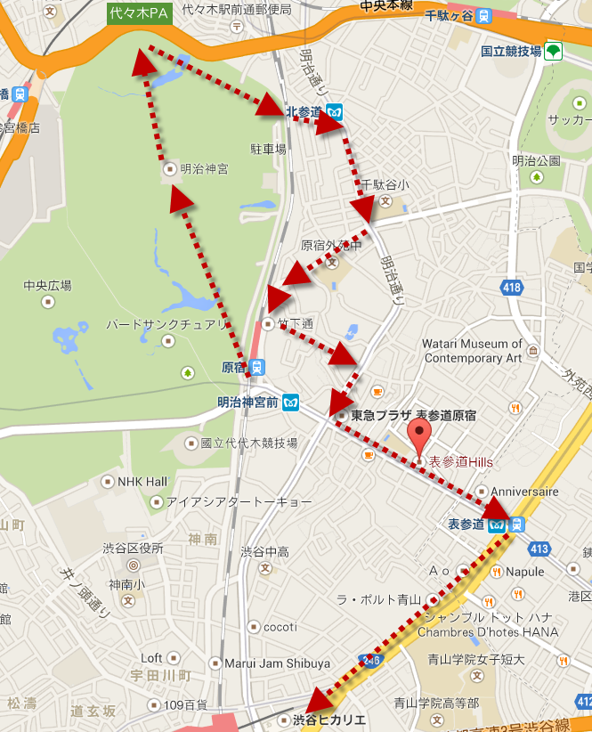 我到這邊三次,每次都是搭乘到原宿後由南參道進入。其實如果時間允許的話也是可以用步行的方式到達代代木後,從北參道進入。